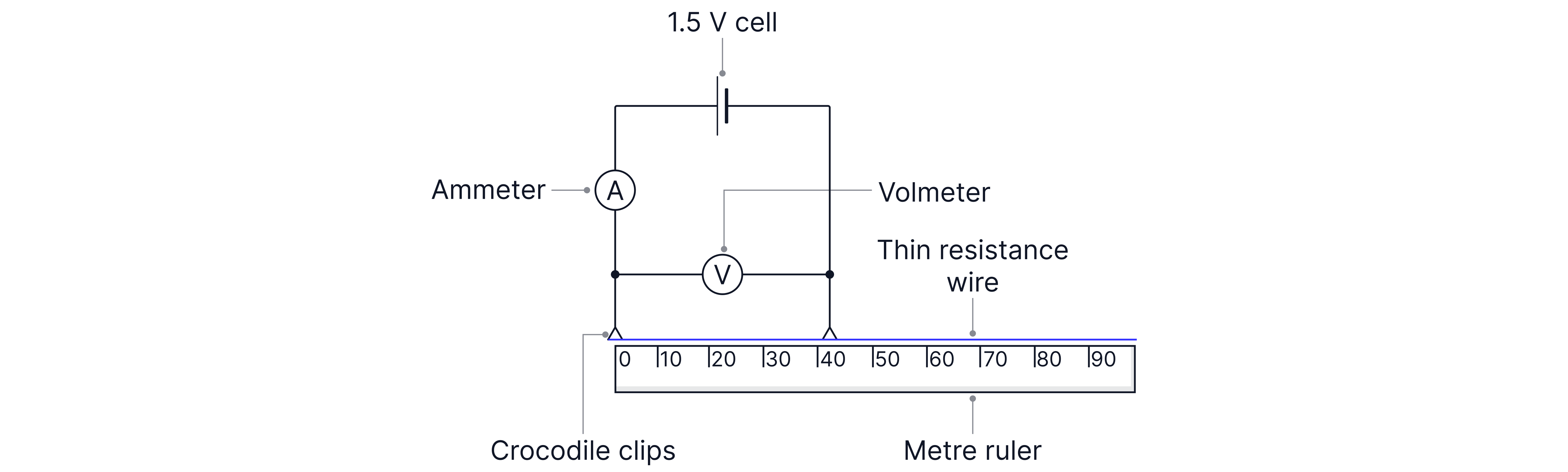 -> Note: When current flows through wires, they heat up. You can sometimes feel this when your phone has been on the charger for a long time. We don't want this to happen because the independent variable in this experiment is the length of the wire. We need everything else to be controlled. To prevent the wires from overheating, we should include a switch in our circuit to turn it off between readings, and we should use a low pd.