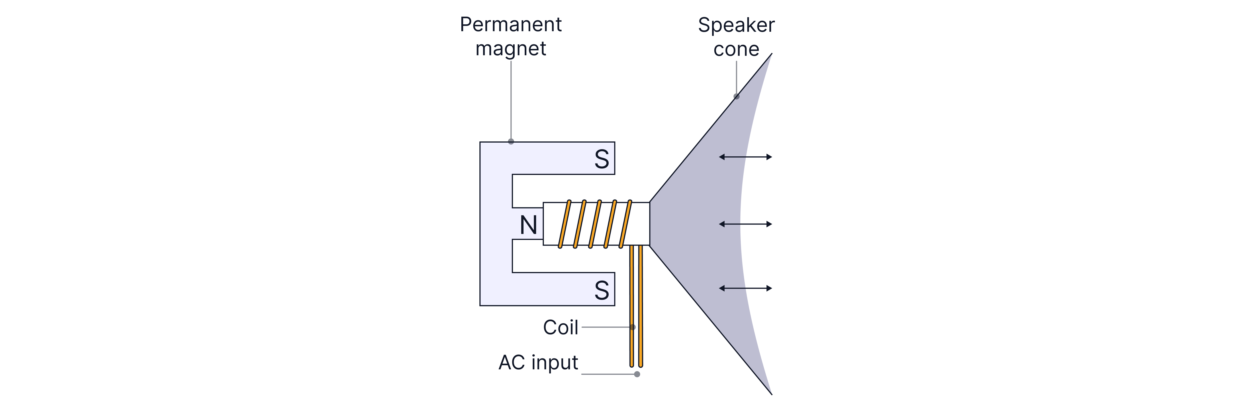 Because the current is constantly changing direction, the force on the coil keeps changing, causing the coil to vibrate. The vibrating coil is attached to a cone, so the cone vibrates as well. As the cone moves backwards and forwards, it causes the air molecules around it to move. This movement creates pressure variations in the air. These pressure variations travel through the air as a sound wave. A larger current produces a larger force and therefore a louder sound, and a higher frequency alternating current will cause the cone to vibrate more frequently, producing a higher pitched sound wave.