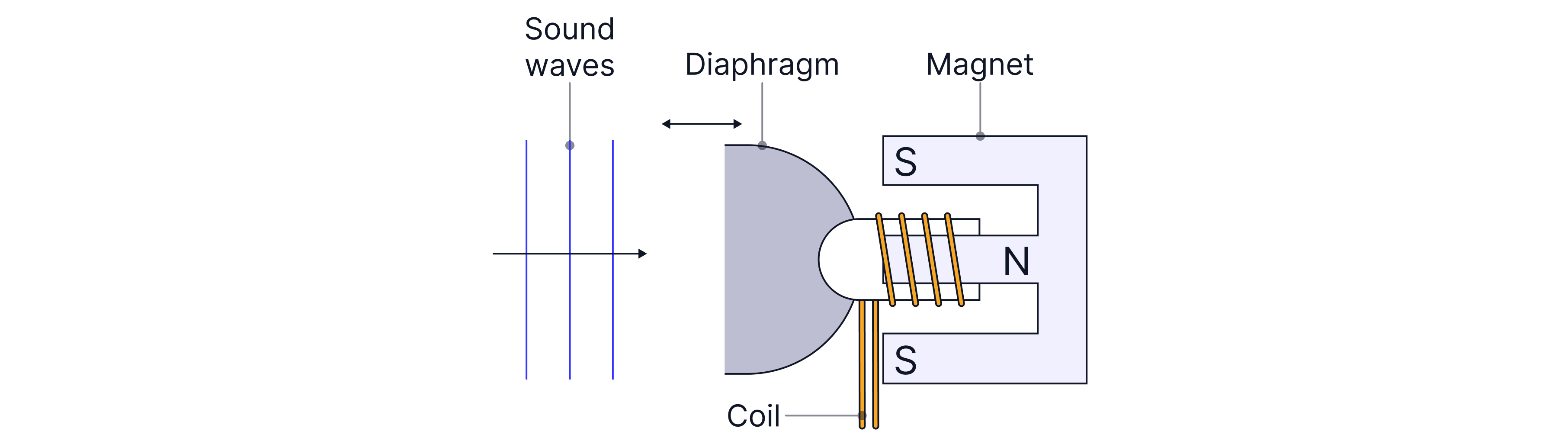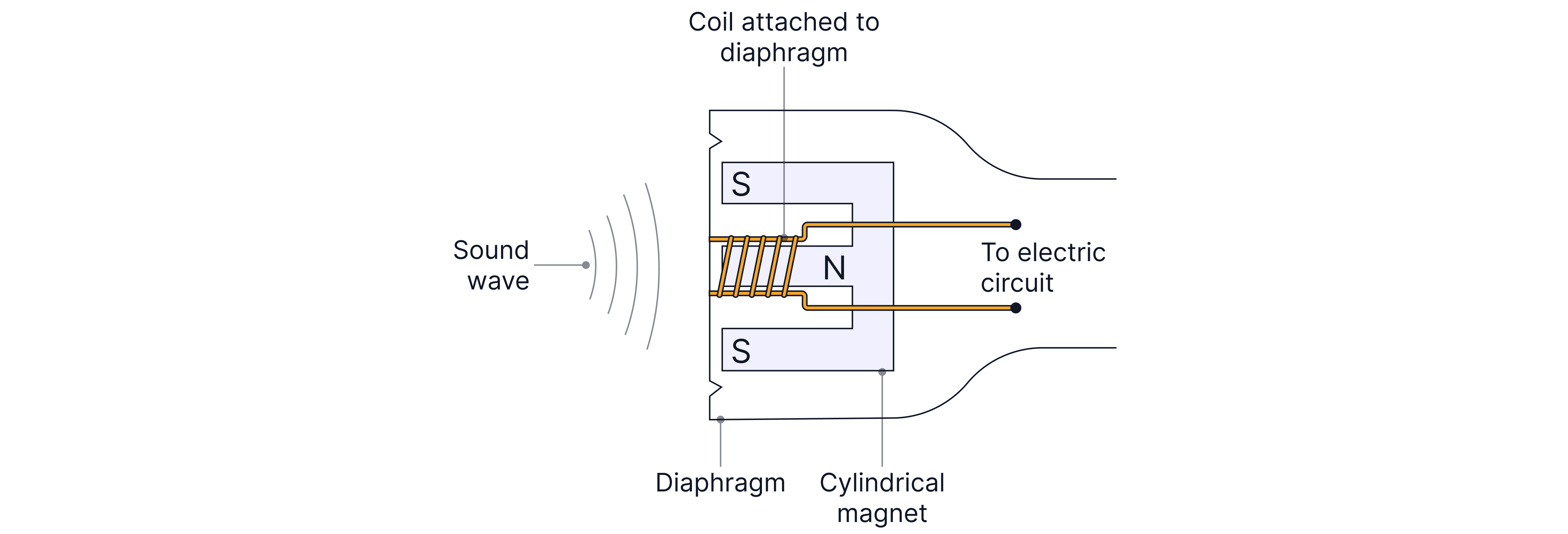 When sound waves reach the microphone, they cause the diaphragm to vibrate. The diaphragm is a thin, flexible piece of plastic that moves easily when sound waves hit it. The vibrating diaphragm causes a coil of wire attached to it to vibrate as well. The coil is placed in a magnetic field produced by a permanent magnet. As the coil vibrates, it moves through the magnetic field and cuts the magnetic field lines. This induces a potential difference across the ends of the coil. The pd induced is alternating (changes direction) because the wire is vibrating, moving back and forth.