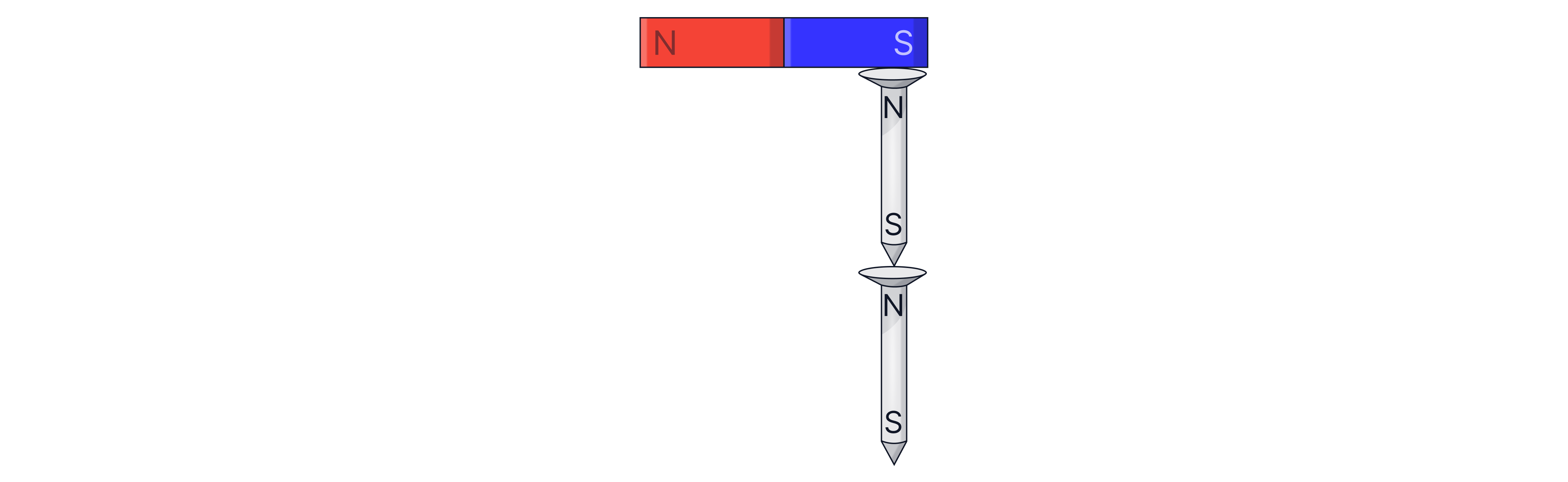 The image shows two iron nails hanging from a bar magnet; they were initially unmagnetised and are now magnetised.