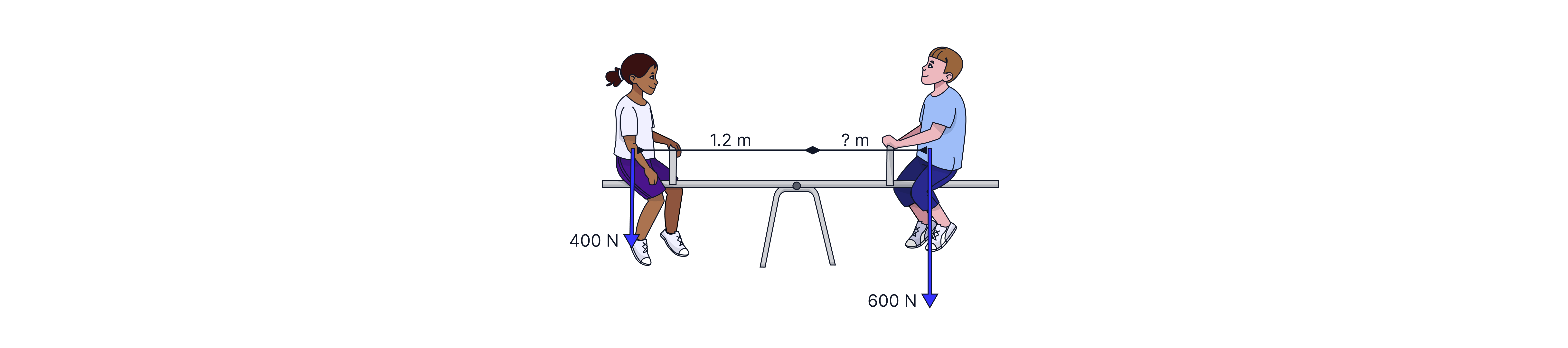I want to find out how far away the boy is sat from the pivot of the seesaw, and I can use the principle of moments to do it. The seesaw is in equilibrium, so the total clockwise moments must equal the total anticlockwise moments. The girl is providing the anticlockwise moment, and I know both her force and distance so I can calculate the moment: