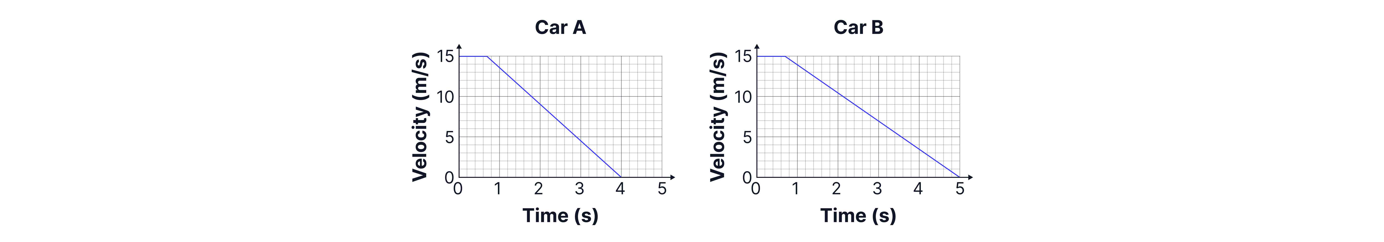 Teacher Tip: Remember that the area under a velocity-time graph gives the displacement or distance travelled in one direction. You could find the stopping distance of both cars in an alternative way: find the gradient of the v-t graph to give acceleration, and use the equation, , knowing that the final speed is zero.