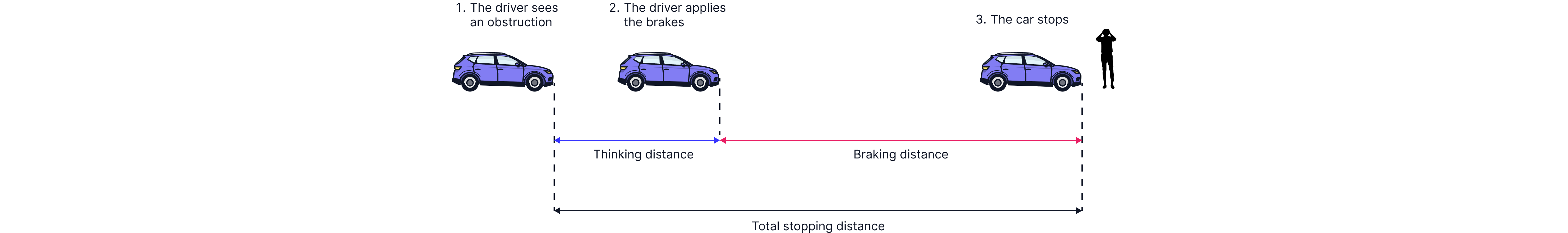 Driving while tired, distracted, or under the influence of alcohol or drugs increases thinking distance, which means you travel further before you even start braking