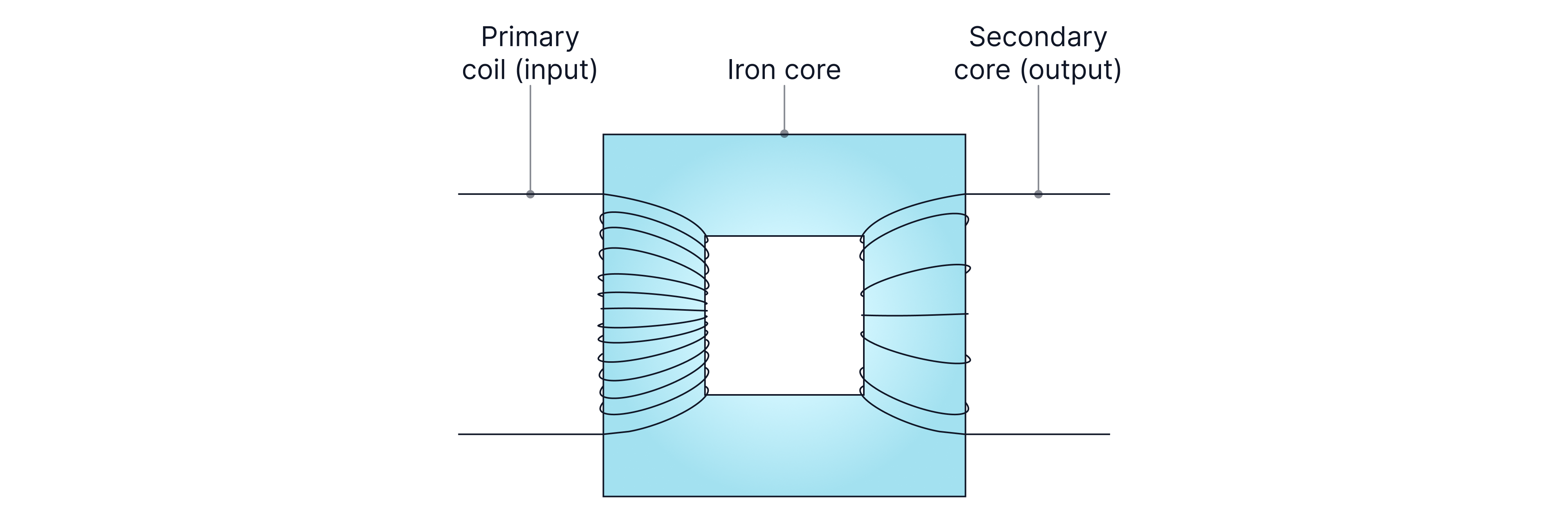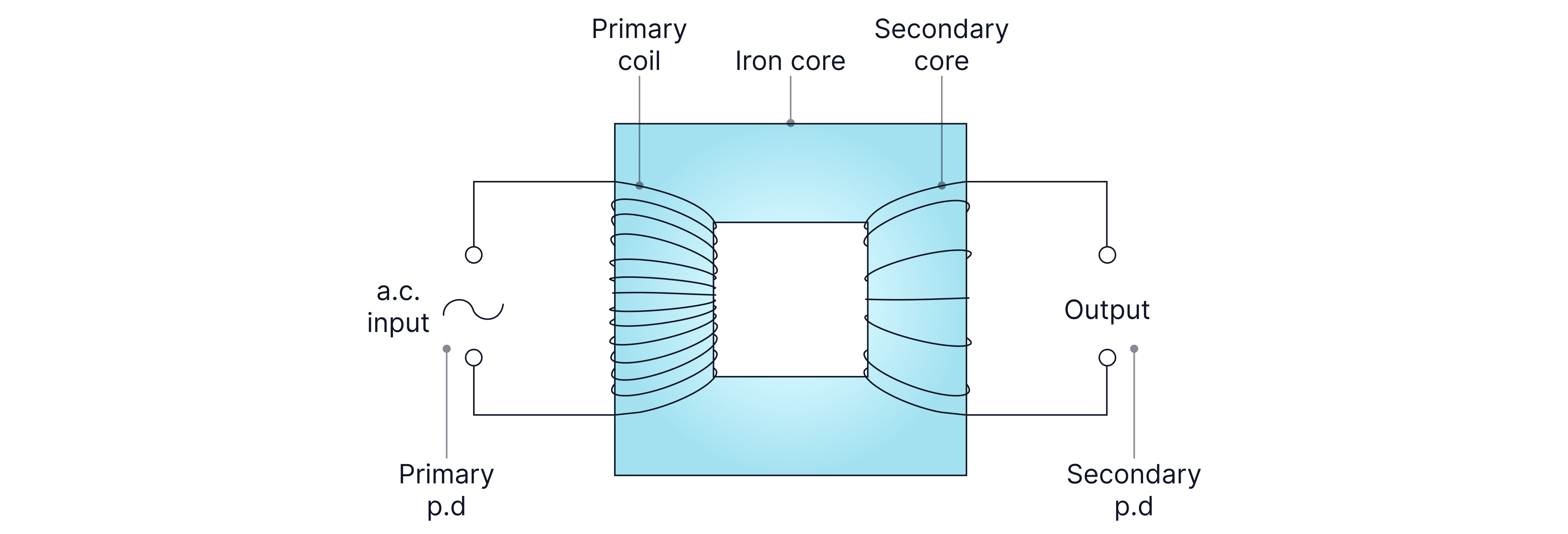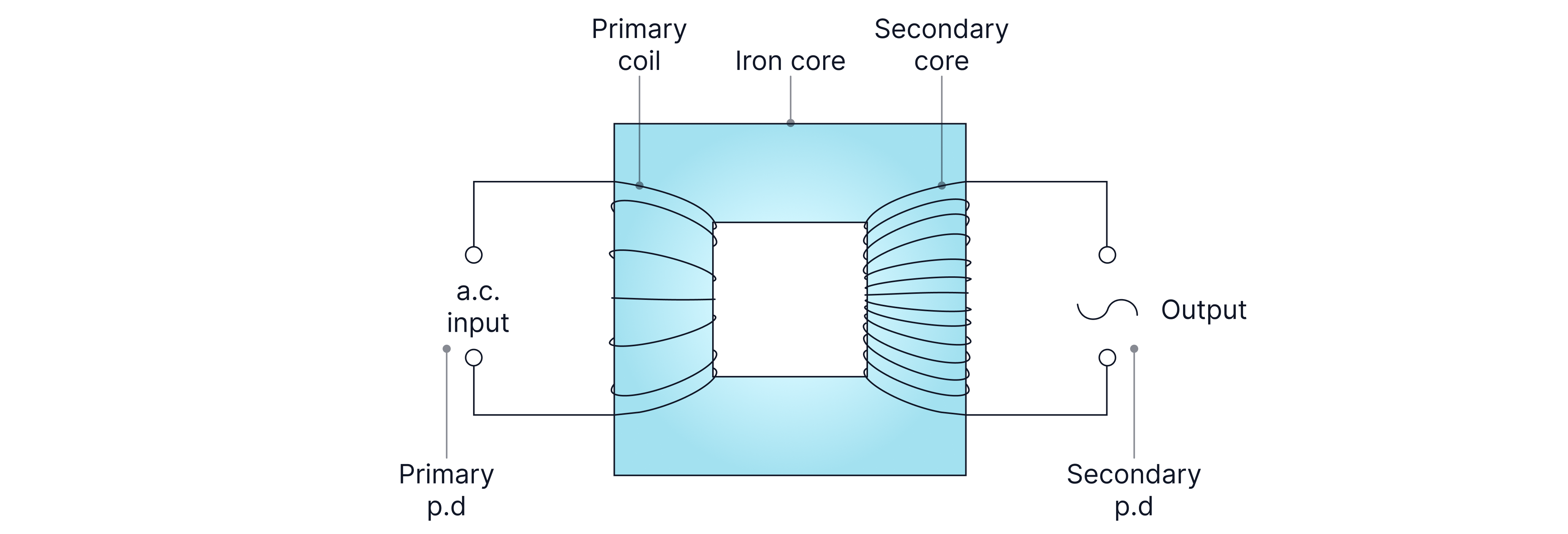 Transformers consist of two coils of wire wrapped around an iron core. Iron is used because it is quick to magnetise and demagnetise. The coil that the current flows through first is called the primary coil, and the other coil is called the secondary coil. The number of turns on each coil determines how the current and potential difference change. If the transformer has more coils on the secondary coil than on the primary coil, the potential difference will increase, so it is called a step-up transformer, as shown below. These are used to increase the pd and thus decrease the current in the cables used to transmit electricity across the national grid to reduce power losses due to heating in the cables.