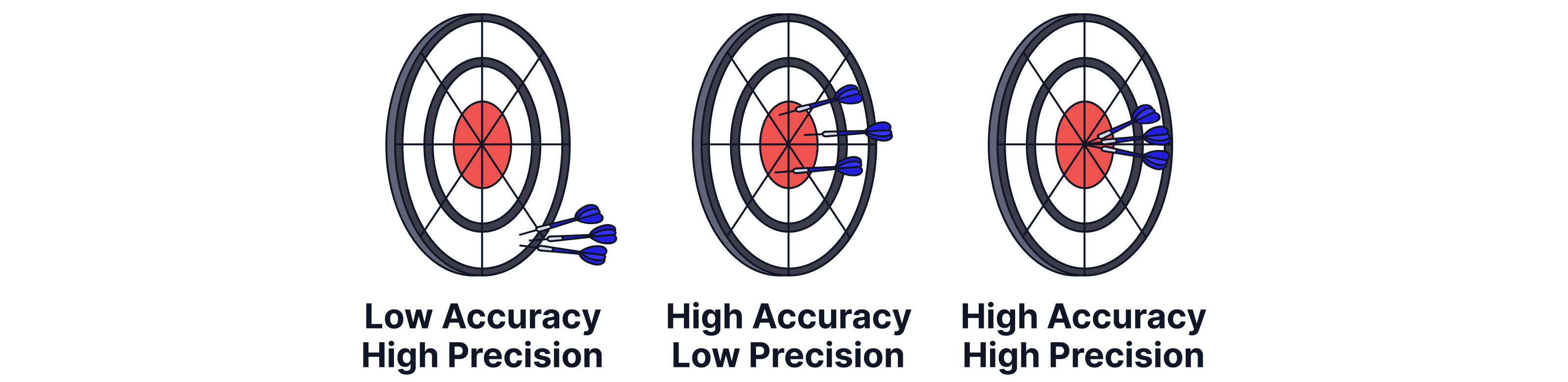 Another way to learn this is to imagine a dartboard. If my throws are precise but not accurate, they will all hit the dartboard really close together but nowhere near the bullseye. If my throws are accurate but not precise, they will all be near the bullseye but not close together. If my throws are precise and accurate, they will all hit the dartboard very close together on the bullseye.