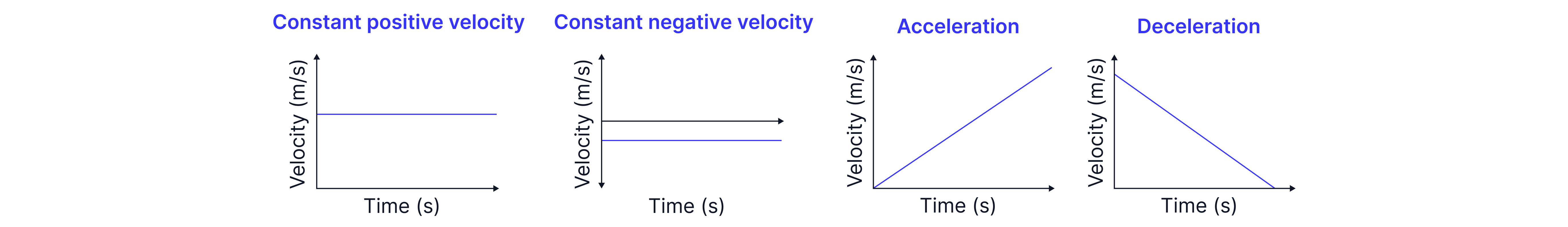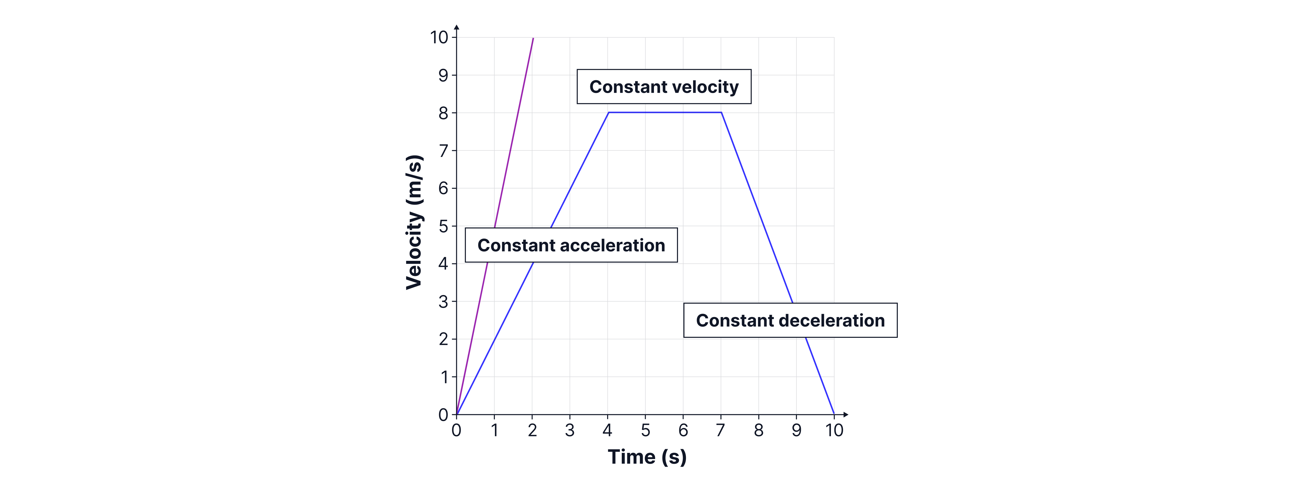 Velocity-time graphs show how an object's velocity changes over time. Remember, velocity is speed in a given direction (a vector quantity), so these graphs can show you not just how fast something's going, but also when it changes direction -> positive velocities mean travelling fowards, , whereas negative velocities mean travelling backwards/in the opposite direction, .