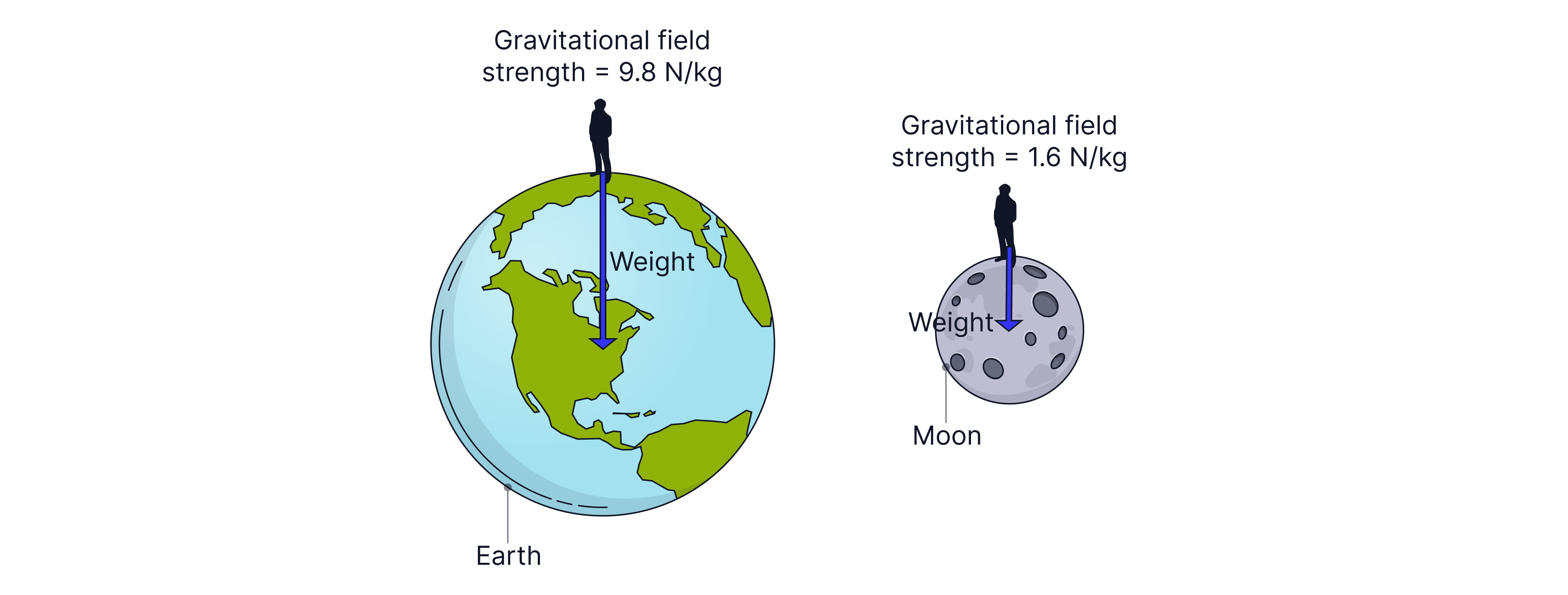 Unlike mass, weight can change depending on where you are. Your weight on the Moon would be much less than on Earth because the Moon has weaker gravity; it is a smaller object, so the force pulling down on you towards its centre is a lot less. However, your mass would be exactly the same. This is why, when astronauts go to the Moon, they seem to float for a while after jumping: there is a much smaller force pulling them down towards the Moon's centre than on Earth, so they do not come down as quickly.
